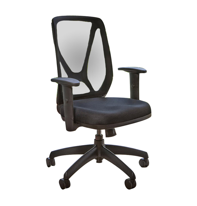 Silla respaldo de mesh, asiento de espuma. Mecanismo basculante en cinco posiciones, apoya brazos regulables en altura, base negra de nylon y ruedas plásticas reforzadas. Uso Intensivo hasta 8 Hs. Opción: Estructura blanca y estrella blanca / Apoya brazos fijos.