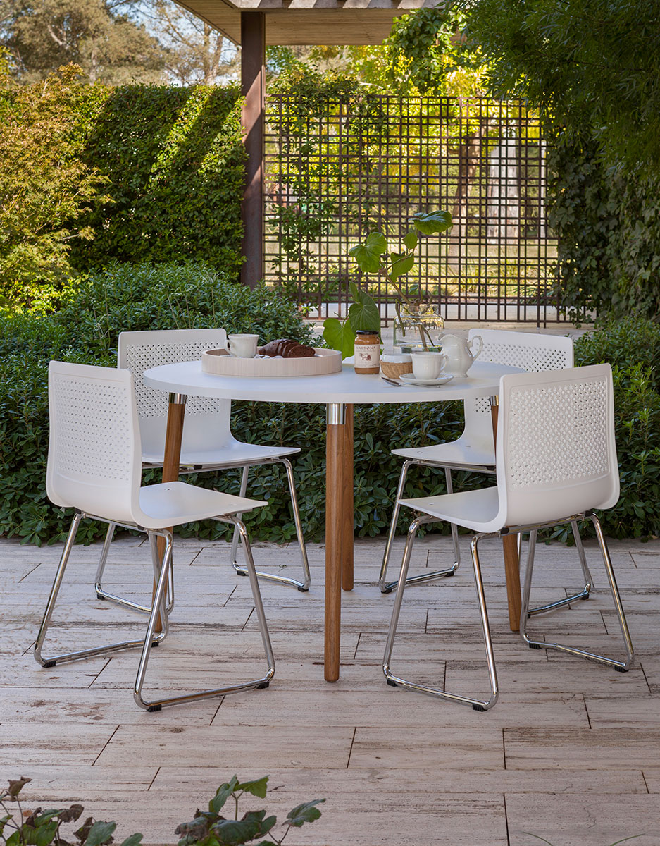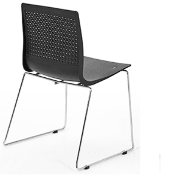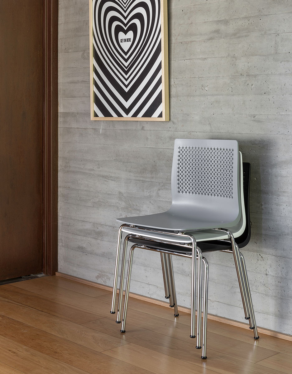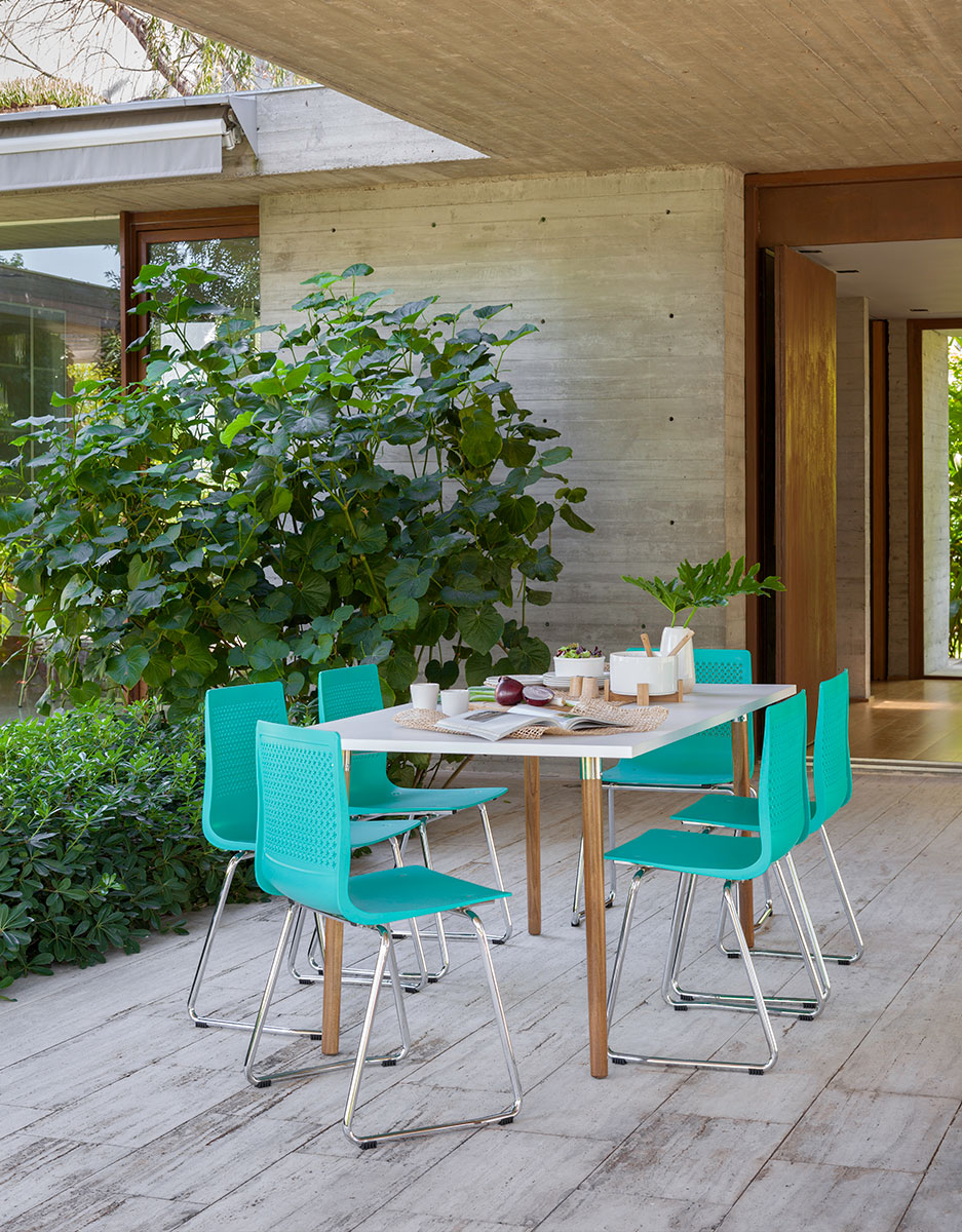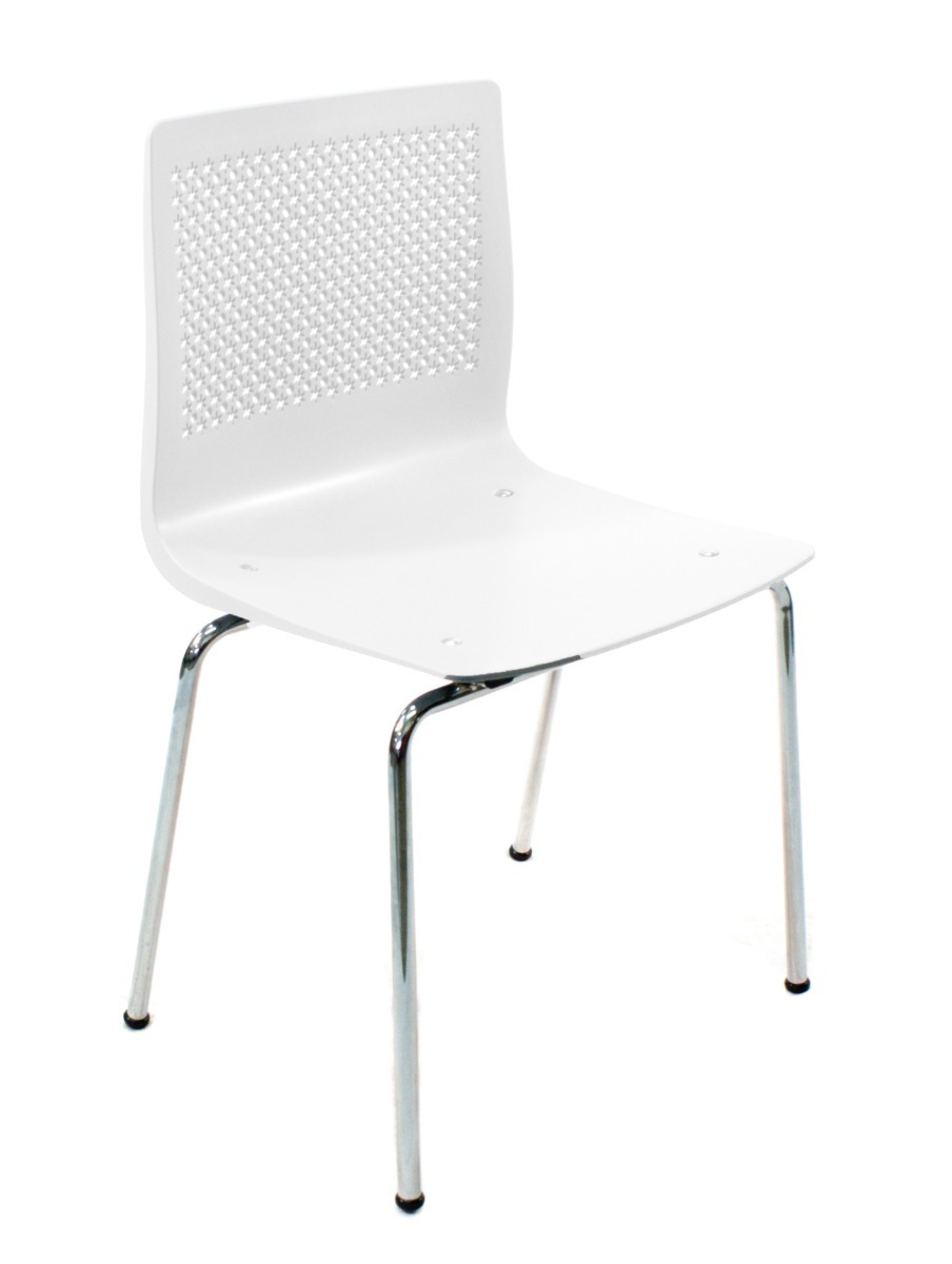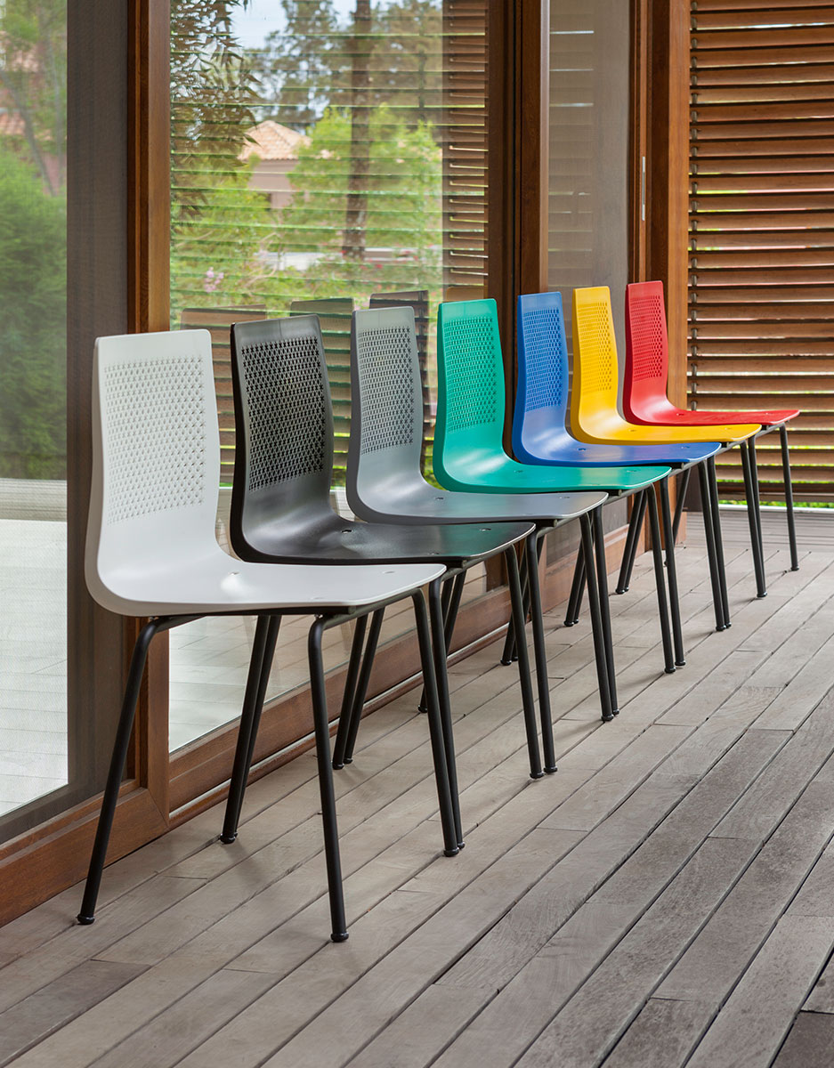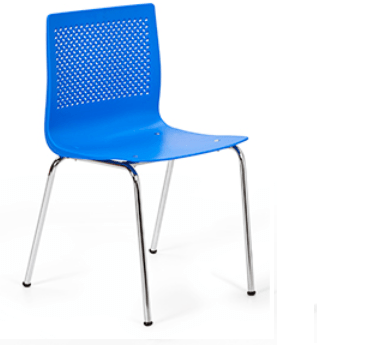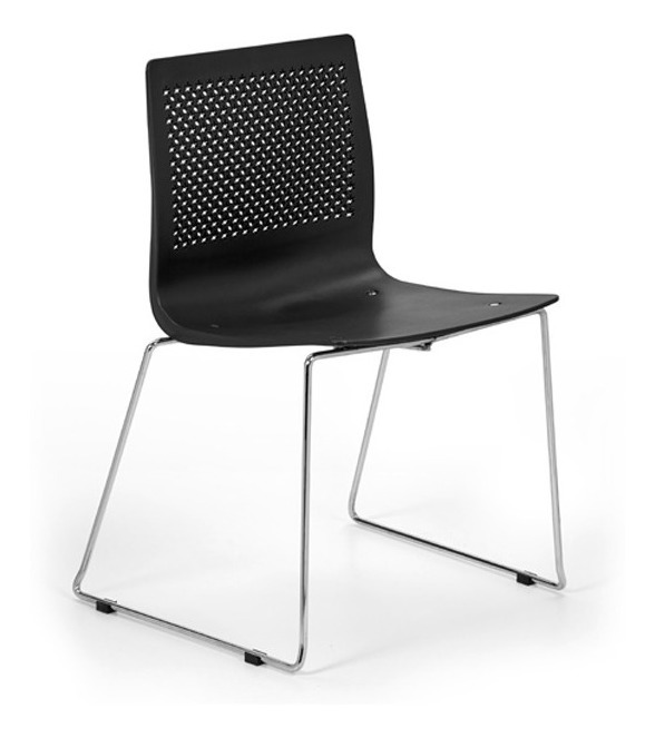 Divertida y práctica Silla de usos múltiples, casco inyectado en polipropileno. Apilable. Base cuatro patas de caño cromado con regatones. Opcional: Giratoria / Trineo