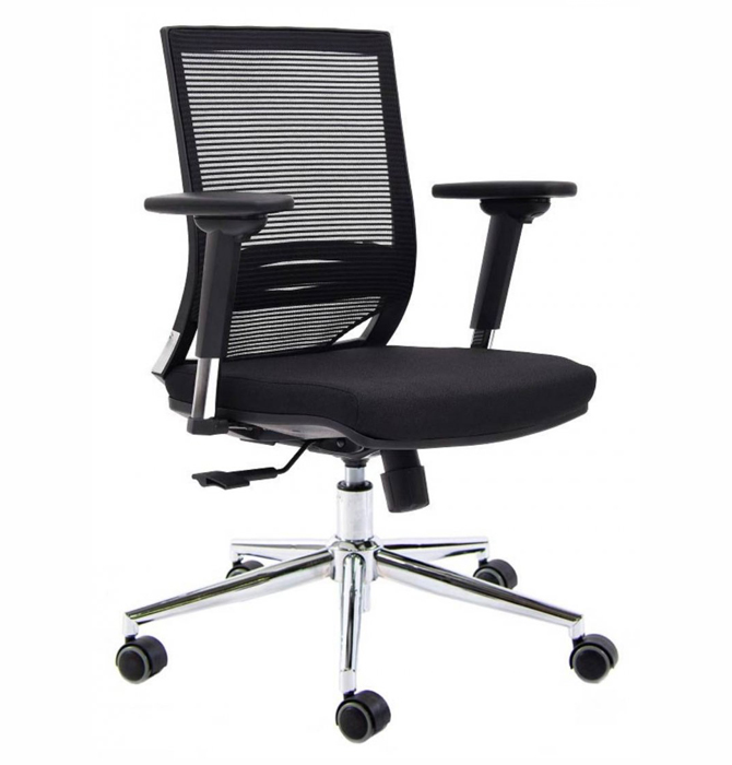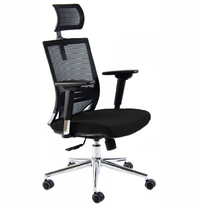 Mecanismo synchron freno multiposición con sistema anti shock para que trabajes con total comodidad. Regulación neumática y de tensión para diferentes pesos del usuario. Respaldo de Nylon, revestido con tela de red mesh lineal negra. Apoyo lumbar regulable. Ruedas banda de goma de 50mm. Uso Intensivo hasta 8 Hs. Opcional: Respaldo con o sin cabezal regulable en altura./ Base Cromada / Base Negra / Apoyabrazos Fijo – 1D – 3D – Cromado.