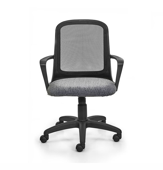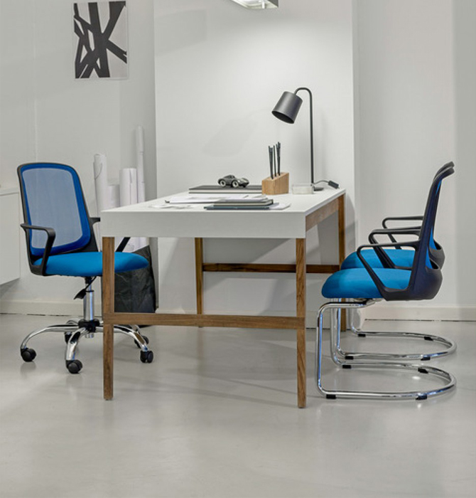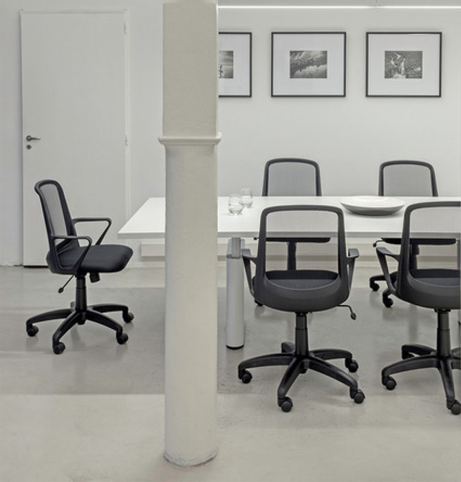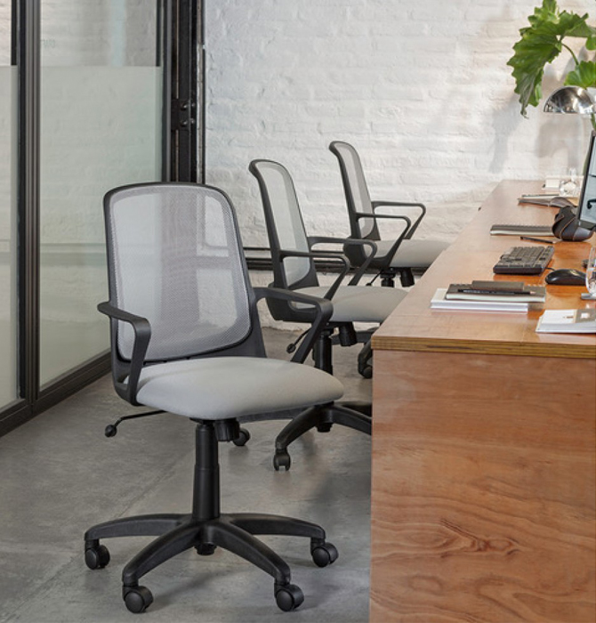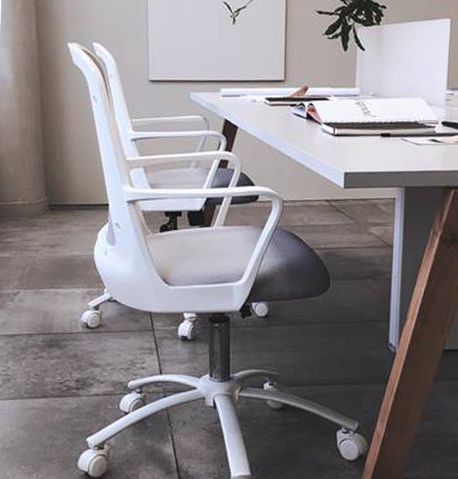 Silla respaldo de mesh y asiento espuma. Mecanismo Neumática / basculante. Brazos incorporados. Uso Intensivo hasta 8 Hs. Opción: Trineo negro/ blanco/ cromado – Aro prolongador cajero. Estructura blanca.