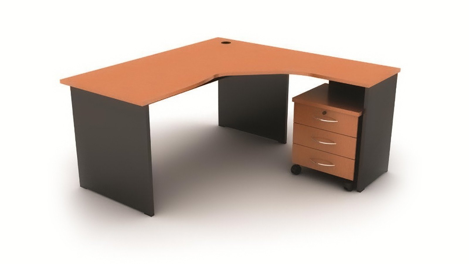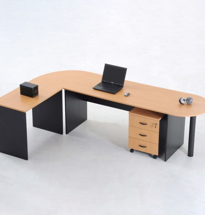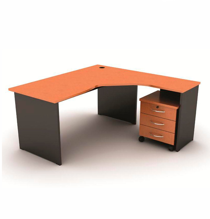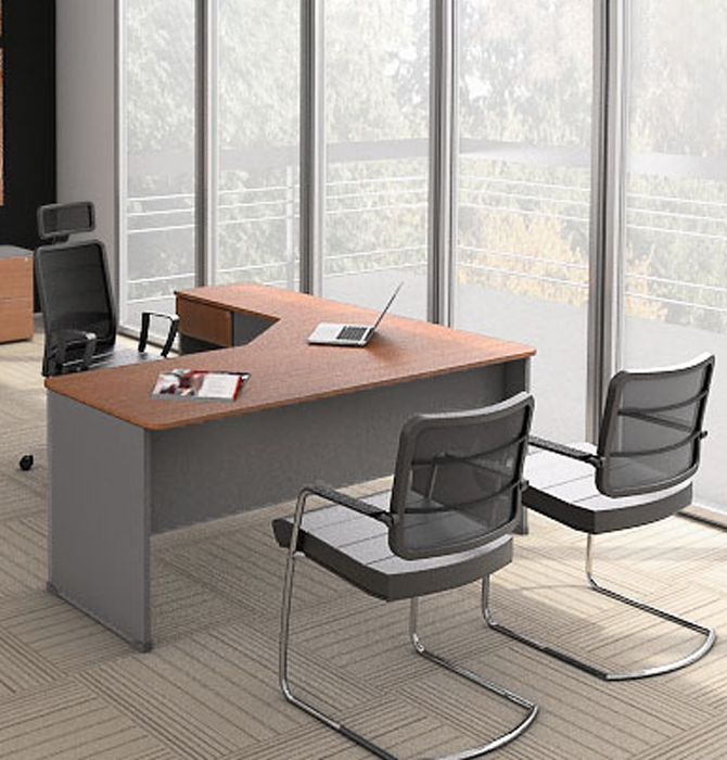 - Escritorio en forma de “L”. Tapa, patas y laterales en aglomerado melamínico de 25 mm / 18 mm o combinado. Cantos tapas con ABS 2 mm, resto con ABS 0,45 mm. Consultar opciones de medidas. Opciones: 2 cajones / 4 cajones /1 cajón y box para CPU.