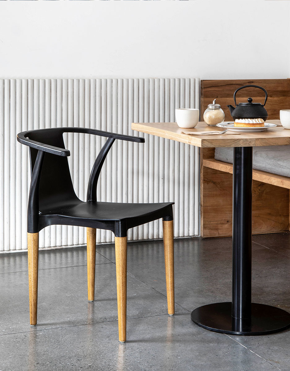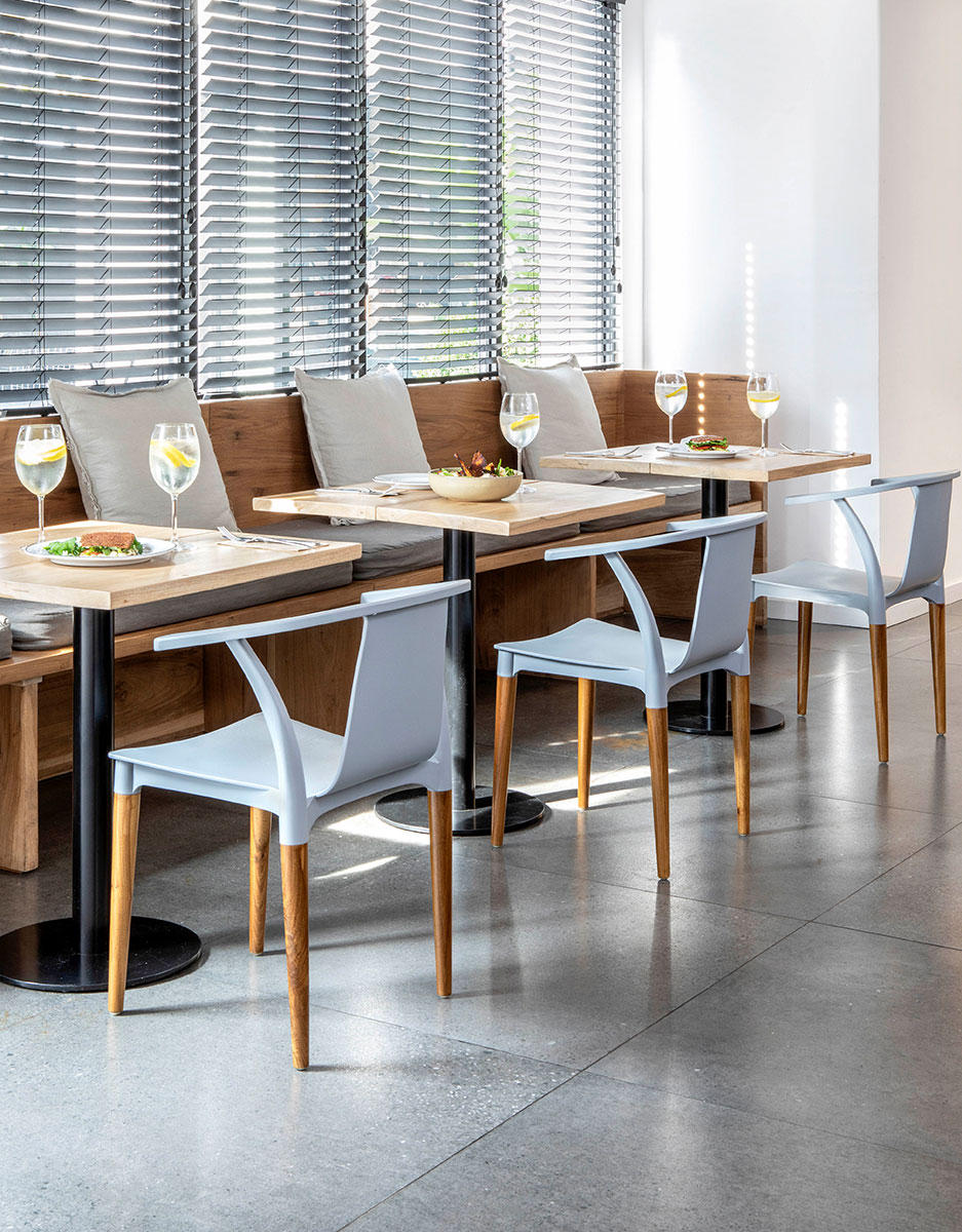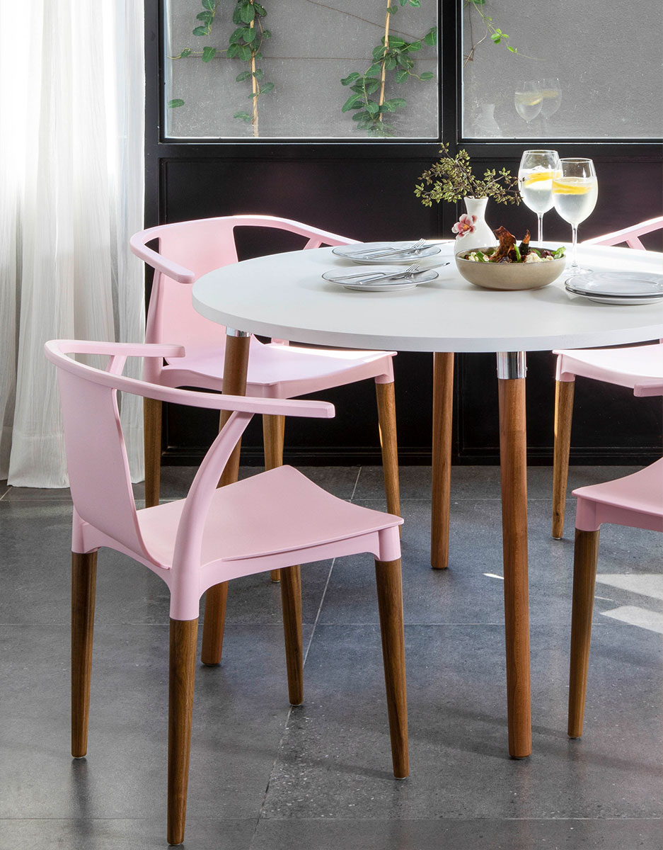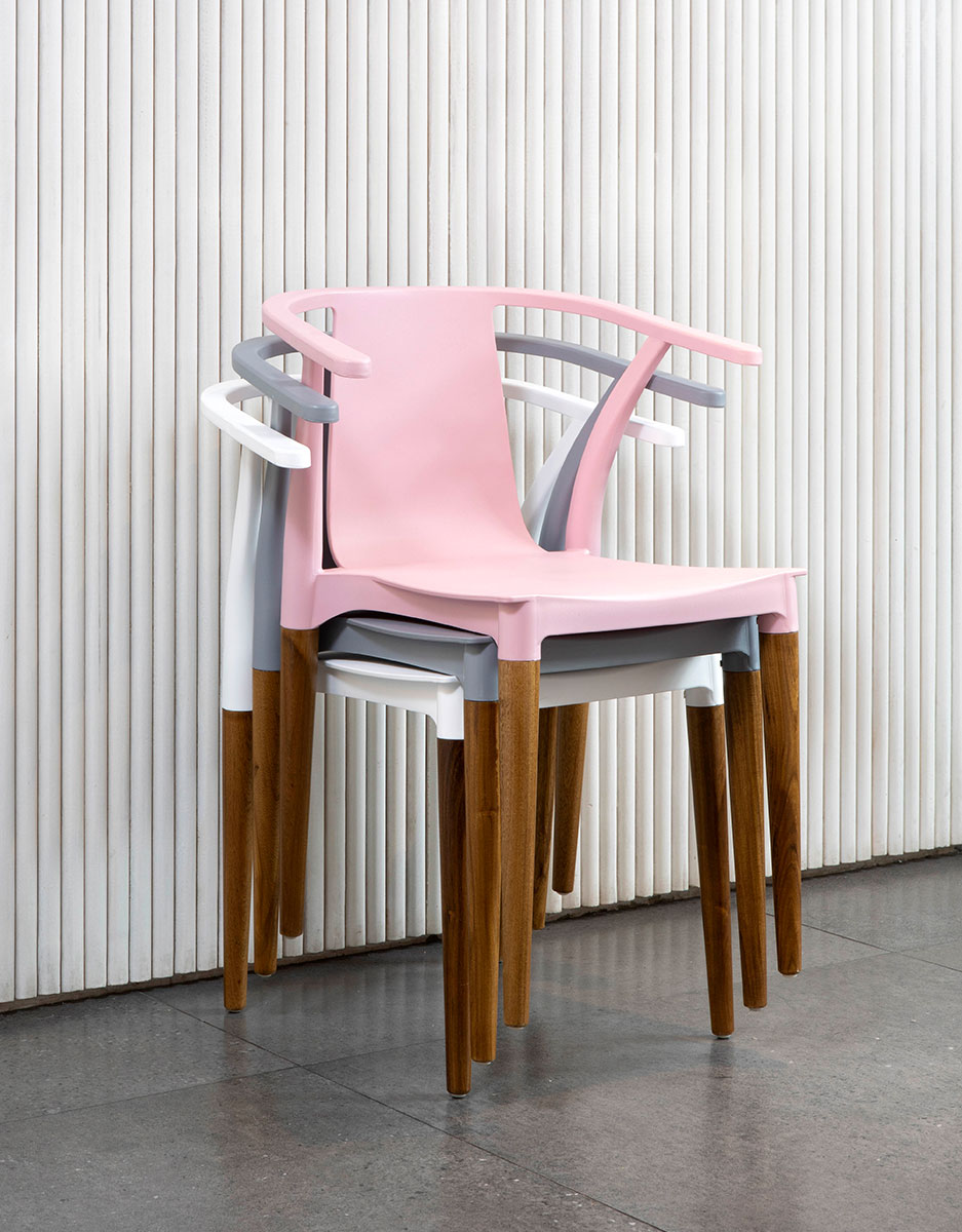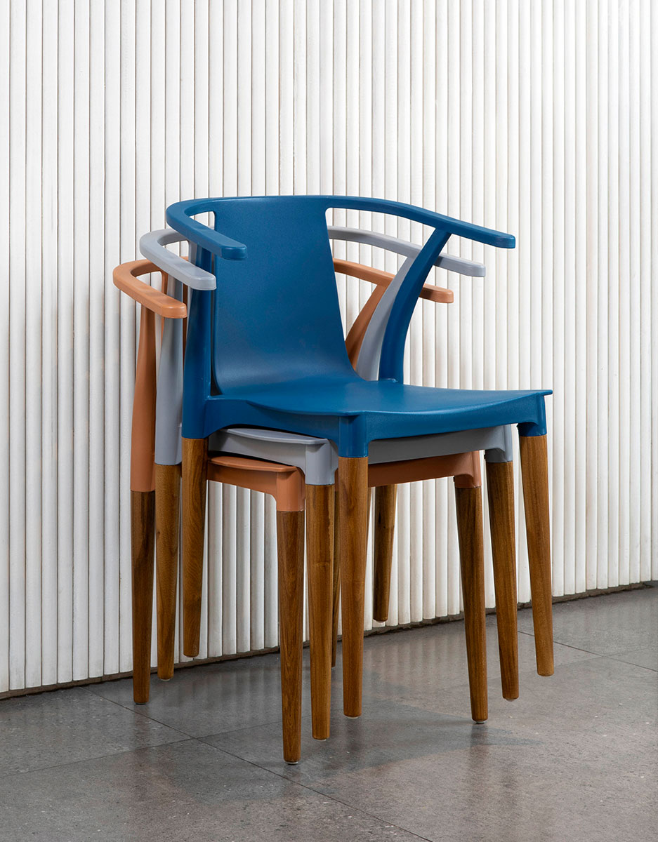 Orgánica y confortable. Estructura en pvc con brazos incorporados. Patas cónicas de madera.