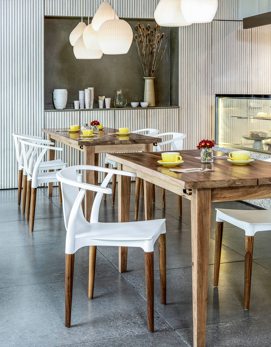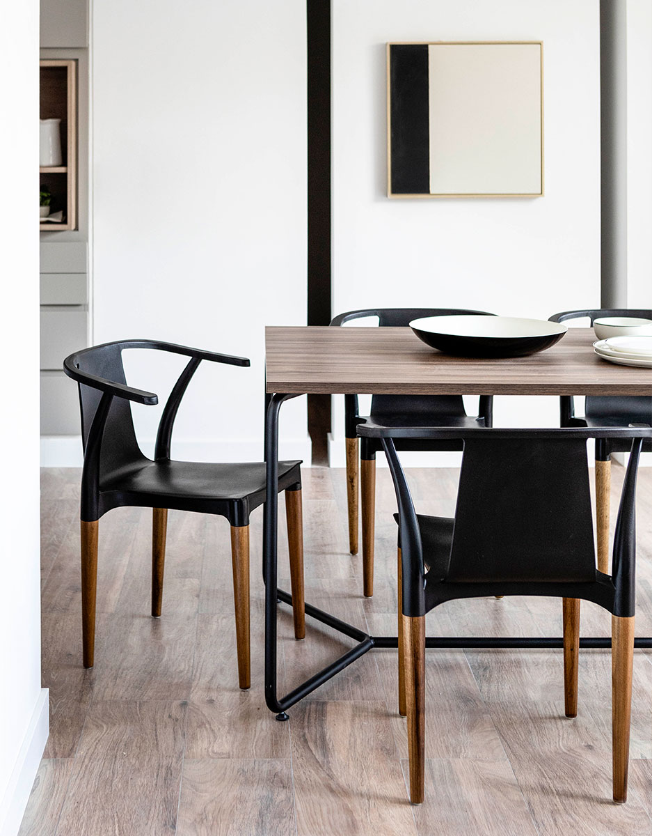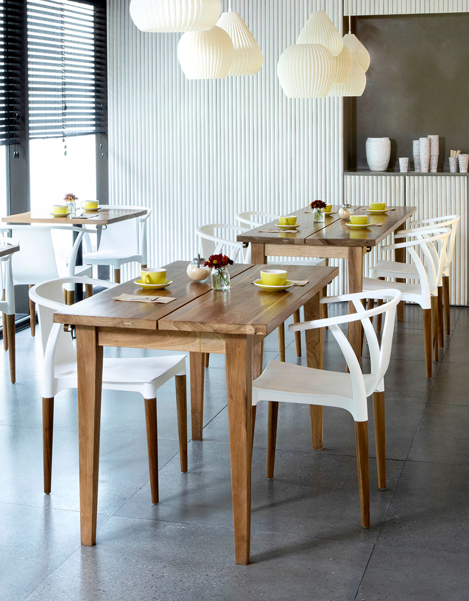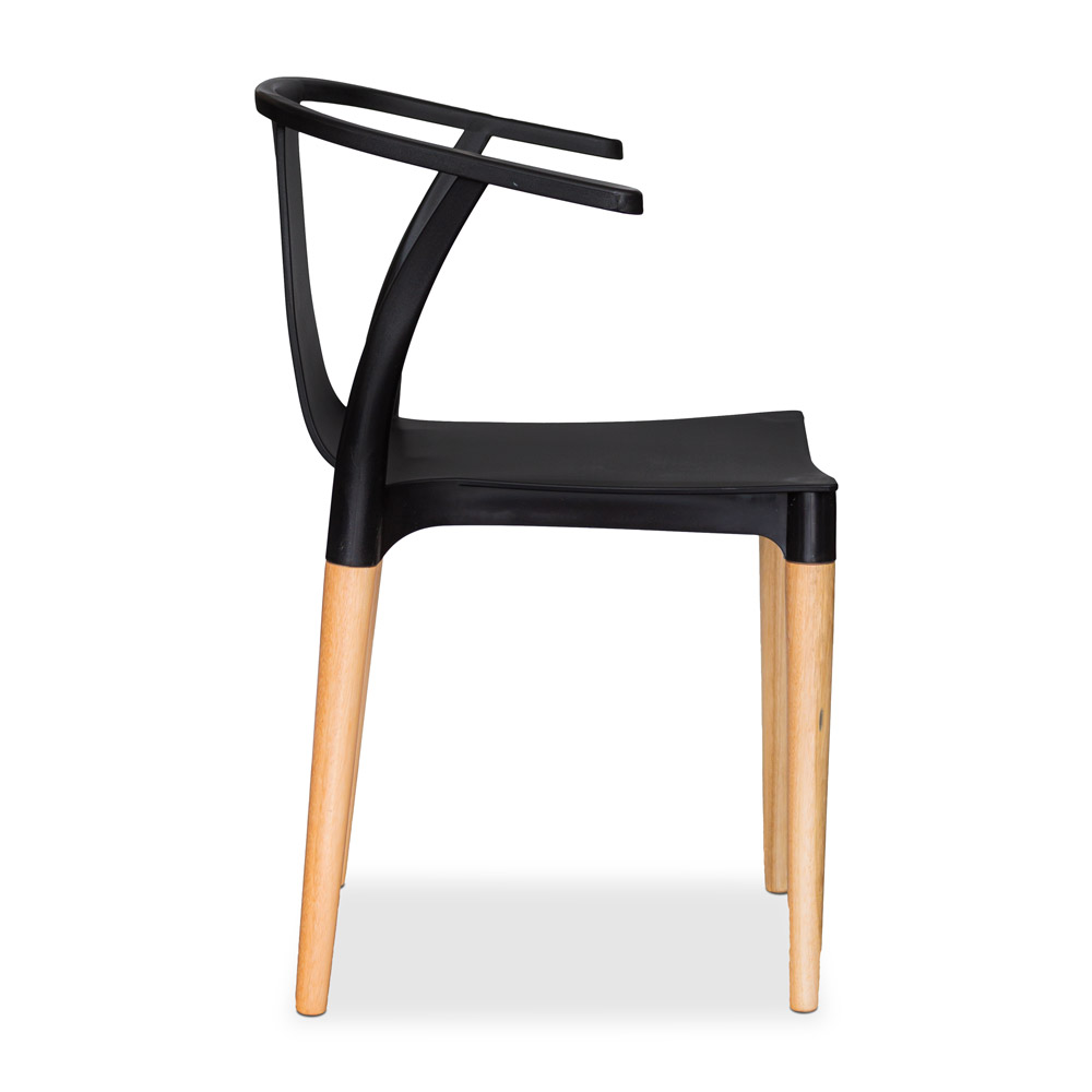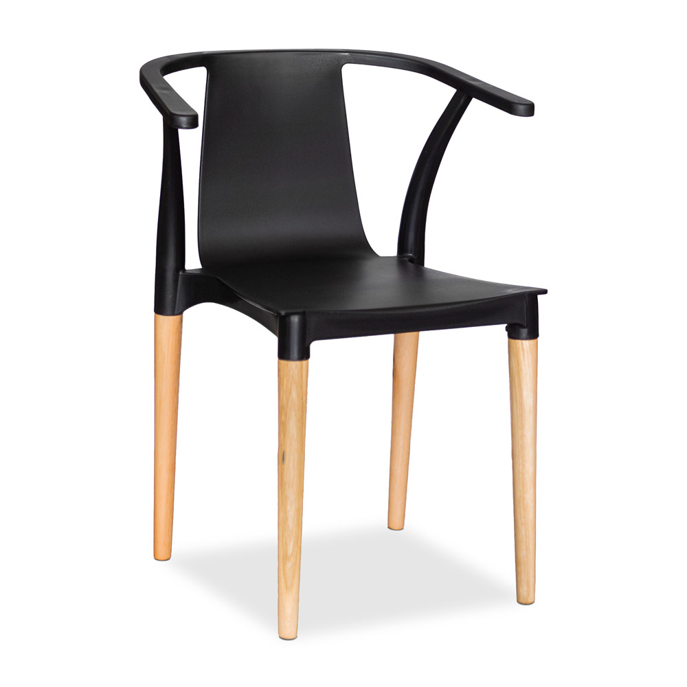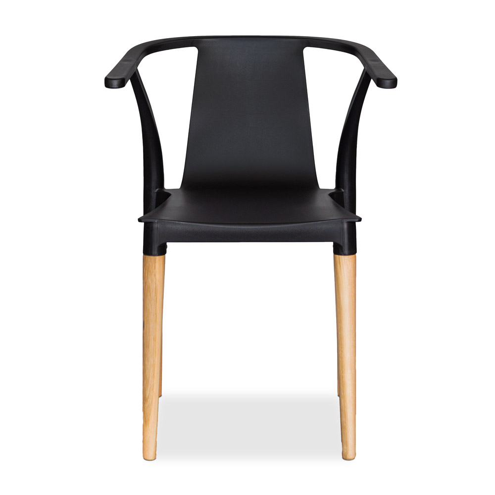 Orgánica y confortable. Estructura en pvc con brazos incorporados. Patas cónicas de madera.