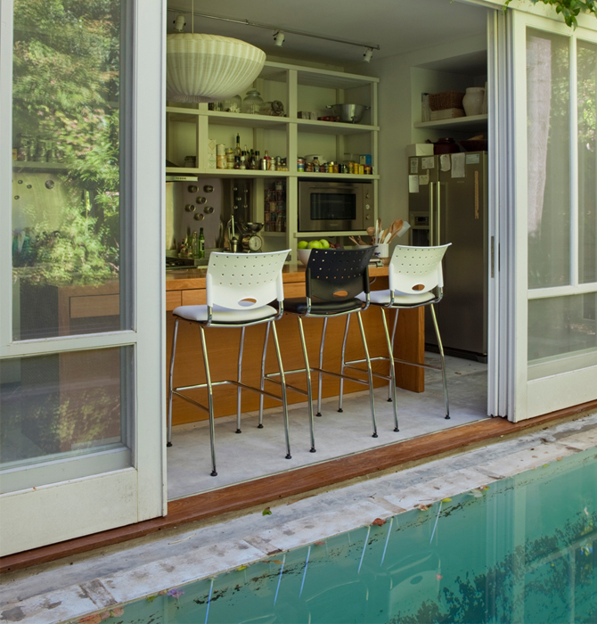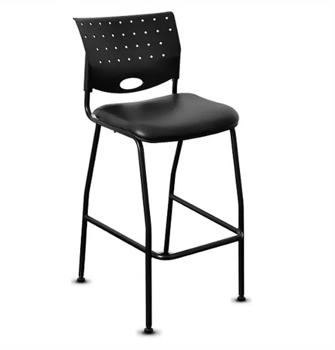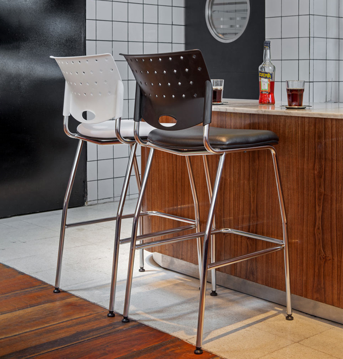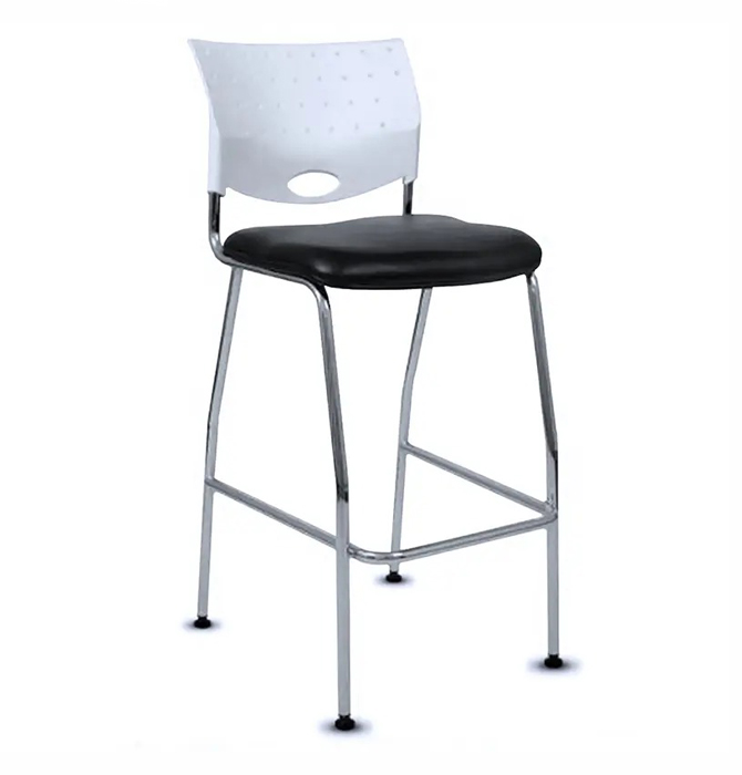Respaldo plástico. Asiento tapizado. Banqueta patas cromadas. Color blanco y negro.